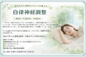 当院では、お身体に負担のない施術で自律神経をバランスよくしっかりと働かせてあげ、どなたも持っている内なるドクター(自己治癒力、免疫力など)がしっかり活躍できる施術をしています。